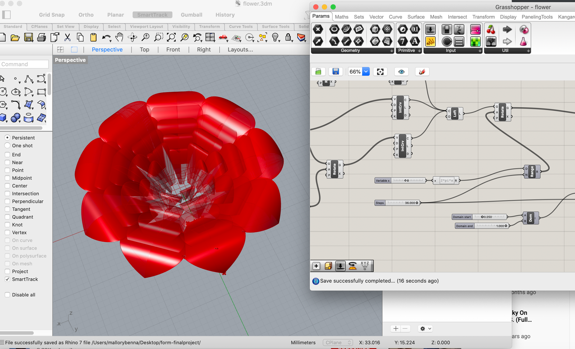 The flowers were modeled in Grasshopper using graphs and multiplier inputs to control points in space and the chair was modeled in Blender.
