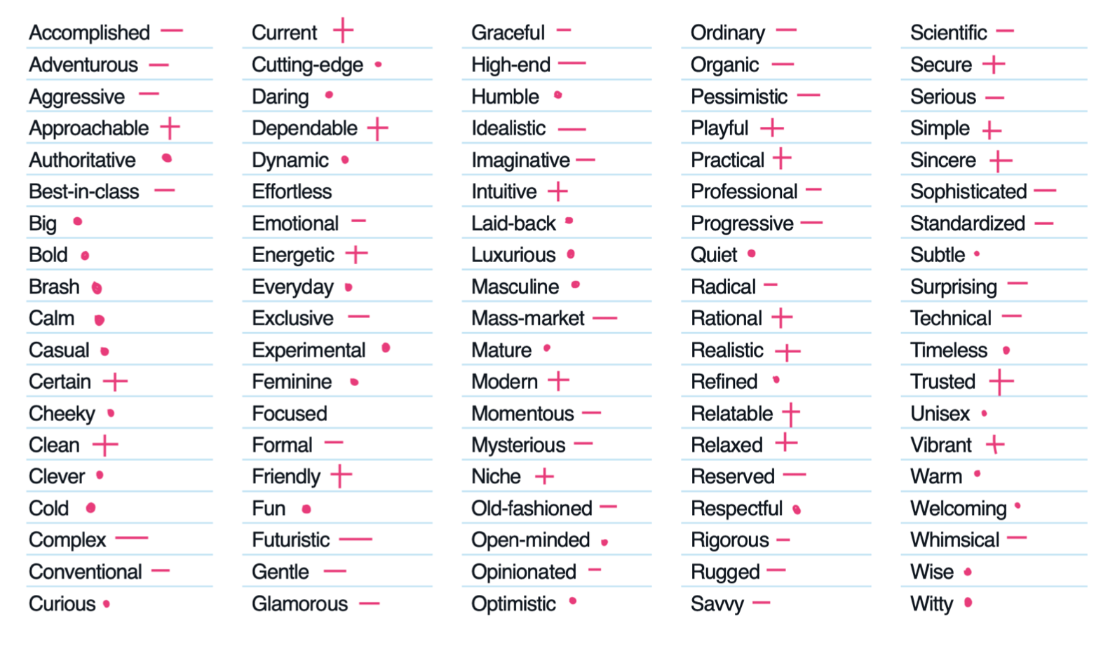 After reviewing a bank of words that could pertain to my app, I marked those that apply with a "+", those that don't apply with a "-", and those that are neutral with a "*"